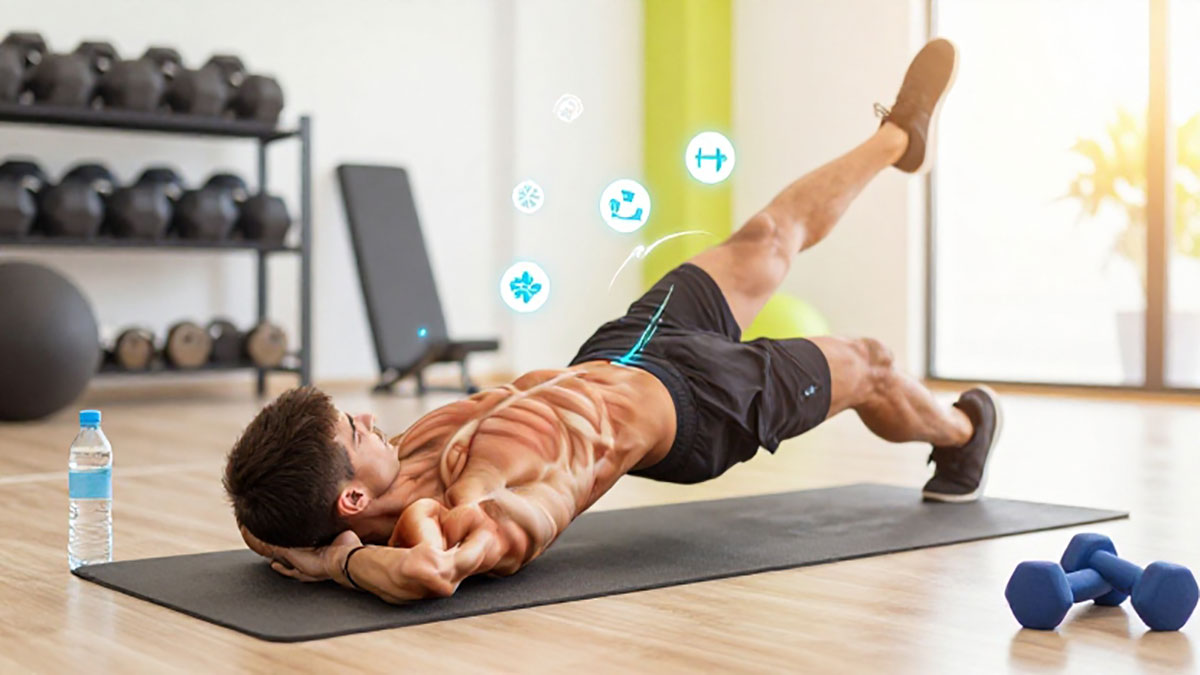 Gerakan ini menargetkan obliques dan rectus abdominis. Lakukan gerakan perlahan untuk memastikan otot bekerja maksimal. - Leg Raises